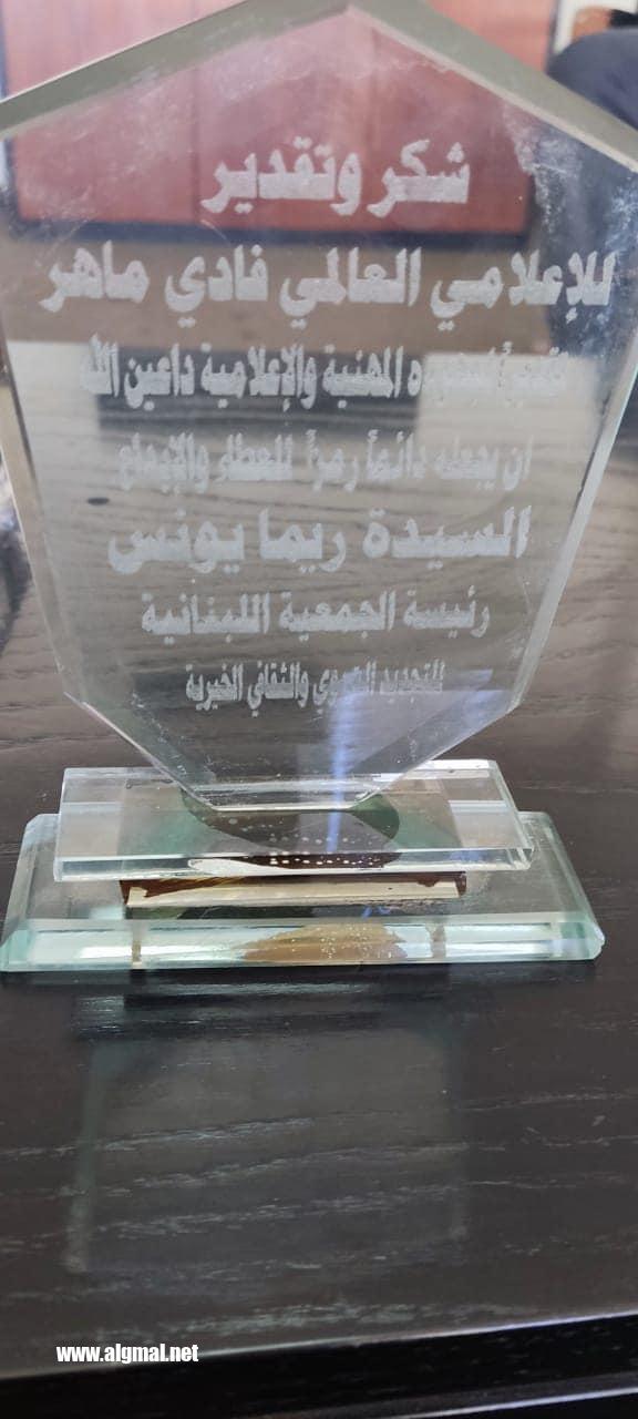 تم التكريم فى قلب عاصمة الإعلام العربي بيروت لبنان من داخل مقر وزارة الإعلام اللبنانية في ضيافة رئيس المجلس الوطني للإعلام المرئي والمسموع بحضور السيدة ريما يونس رئيسة الجمعية اللبنانية للتجديد التربوي والثقافي الخيرية