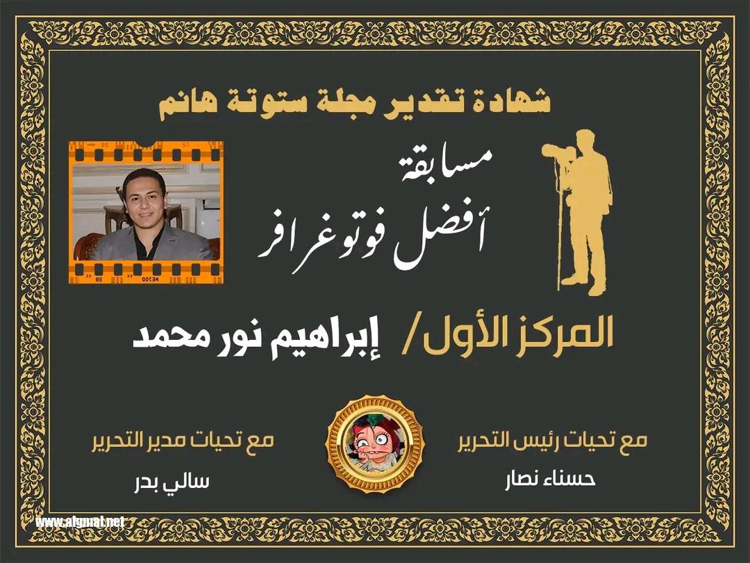 حصل المصور الصحفي إبراهيم نور على المركز الأول في مسابقة التصوير الفوتوغرافي التي نظمتها مجلة ستوتة هانم.