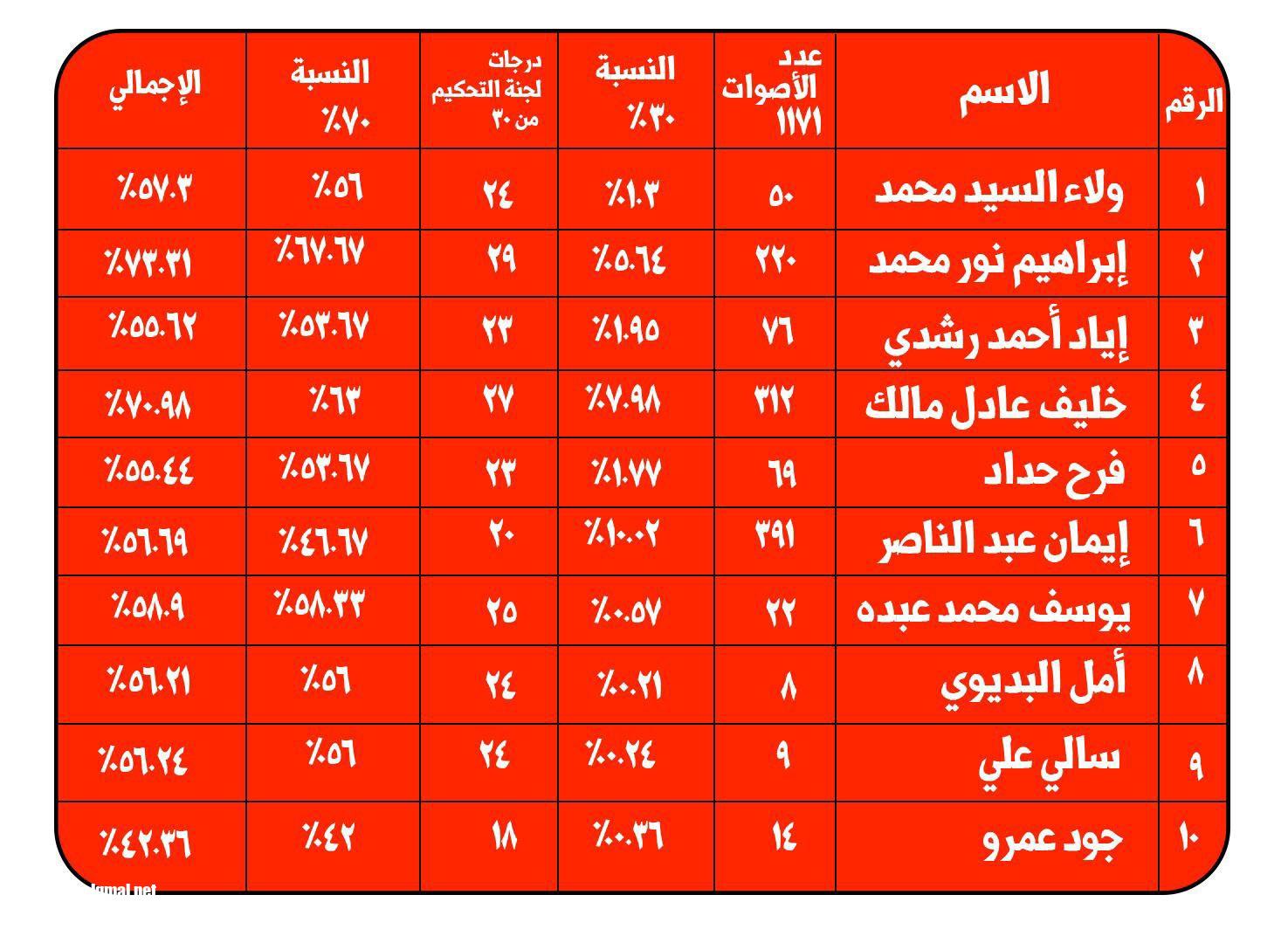 وخلال الجدول التالي نوضح لكم النسبة المئوية لكل المشاركين وعدد الأصوات التي حصل عليها كل متسابق ونقاط لجنة التحكيم:-