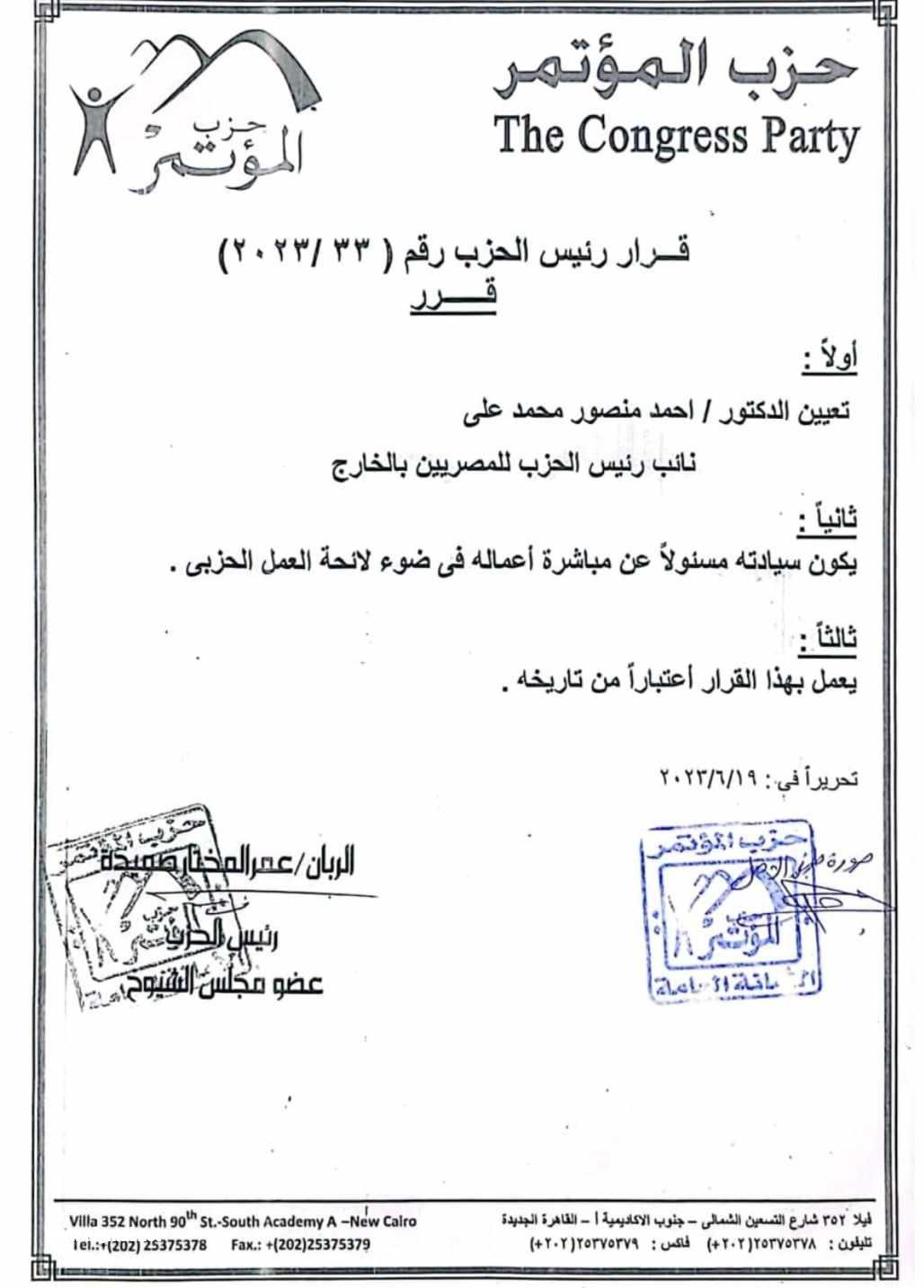 بتعيين رجل الاعمال الدكتور ‘ احمد منصور محمد على’ نائبا لرئيس حزب المؤتمر للمصريين بالخارج ..