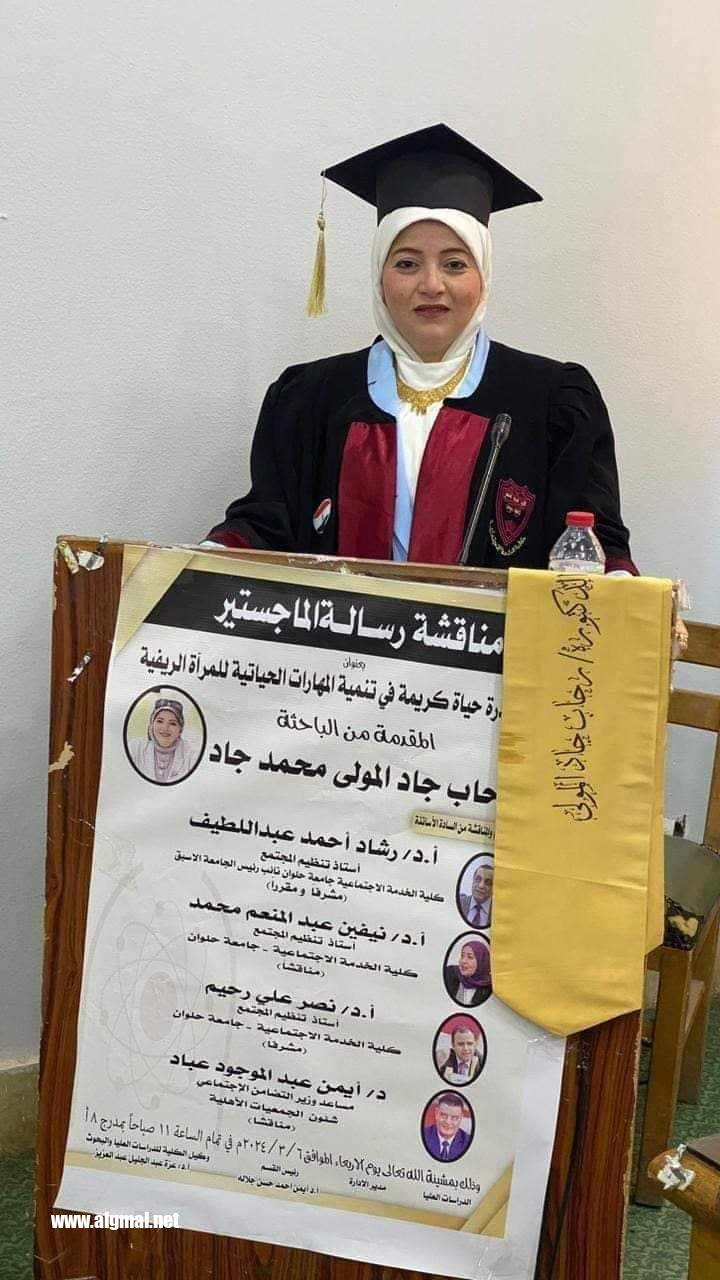 لحصولها  على الماجستير بدرجة امتياز جامعه حلوان  في مبادرة حياه كريمه في تنميه المهارات الحياتية للمراه الريفيه
