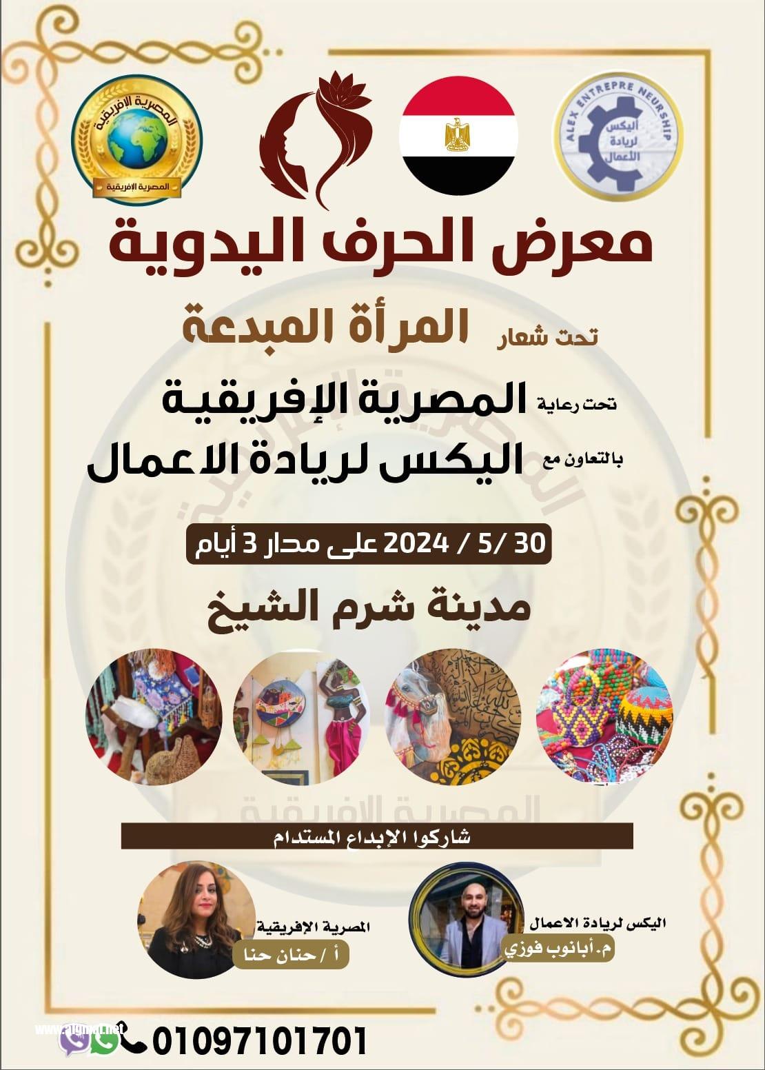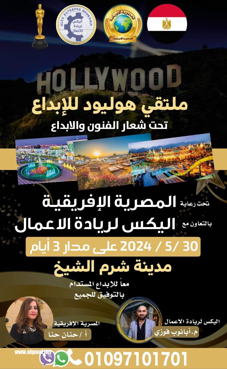 فى اطار فعاليات ملتقي هوليود للابداع والفنون والثقافة والذى يقام يوم 30 مايو القادم .. على مدار 3 ايام بمدينة السحر والجمال شرم الشيخ .. برعاية المصرية الإفريقية برئاسة الأستاذة حنان حنا واليكس لريادة الاعمال برئاسة المهندس ابانوب فوزى