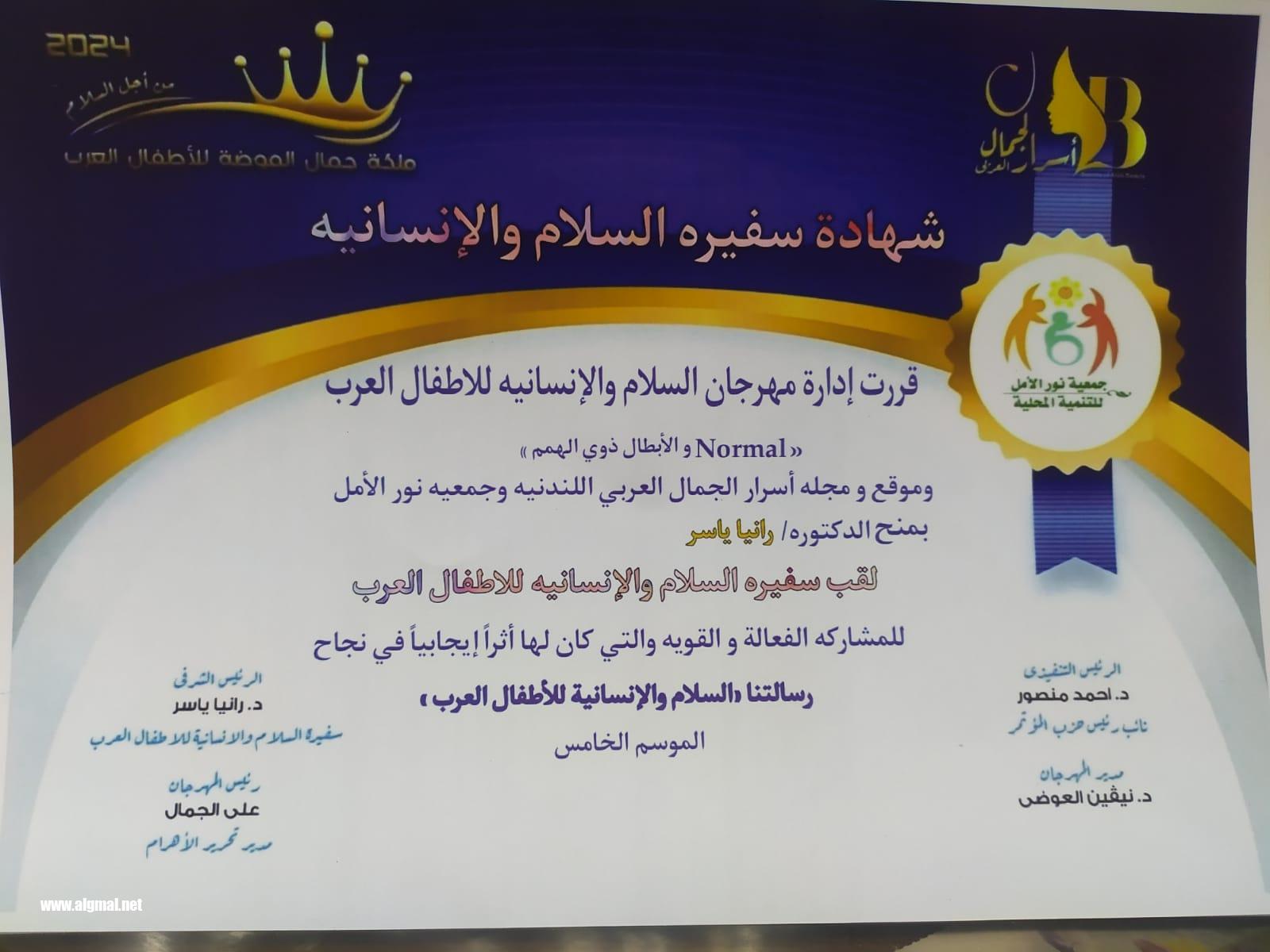 منح لقب “سفيرة السلام والإنسانية للأطفال العرب “. الى الدكتورة رانيا ياسر ..سيدة الاعمال الاردنية .. لدعما اللا محدود فى مساندة هولاء الاطفال الملائكة .. لانهم من سيحملون شعلة النجاح والتطور لأوطاننا العربية .